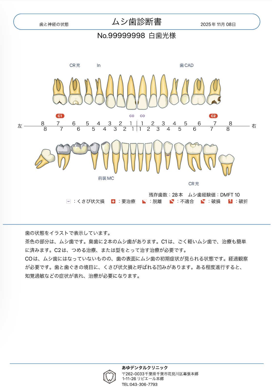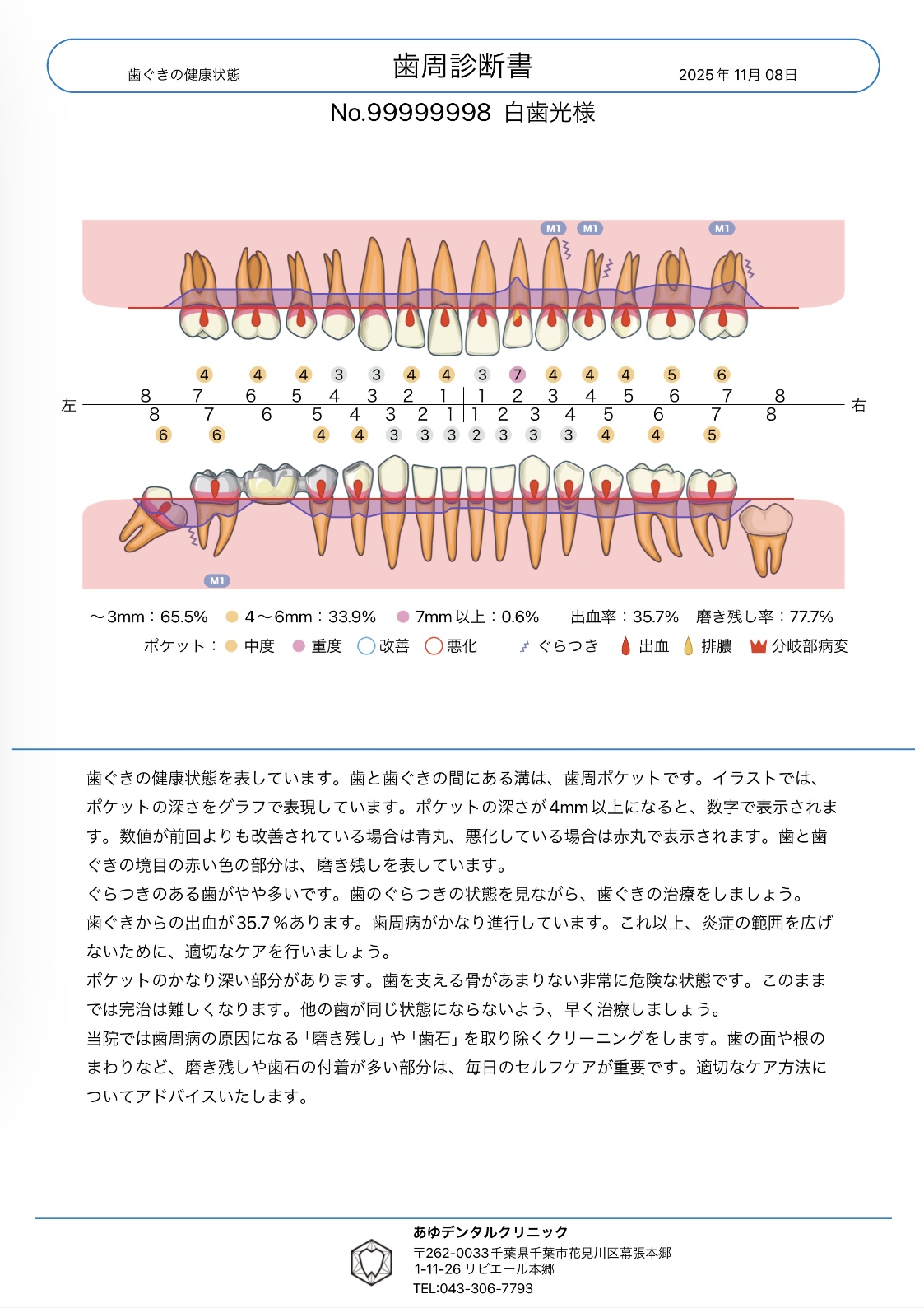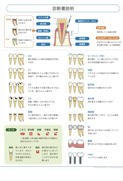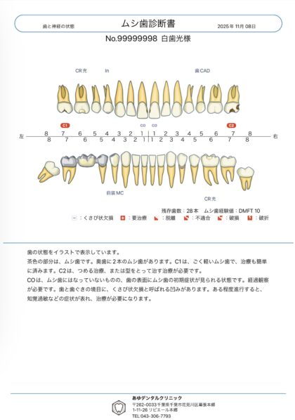 内容は、むし歯、歯ぐきの状態、磨き残しの場所などをイラストや数値で示したものです。