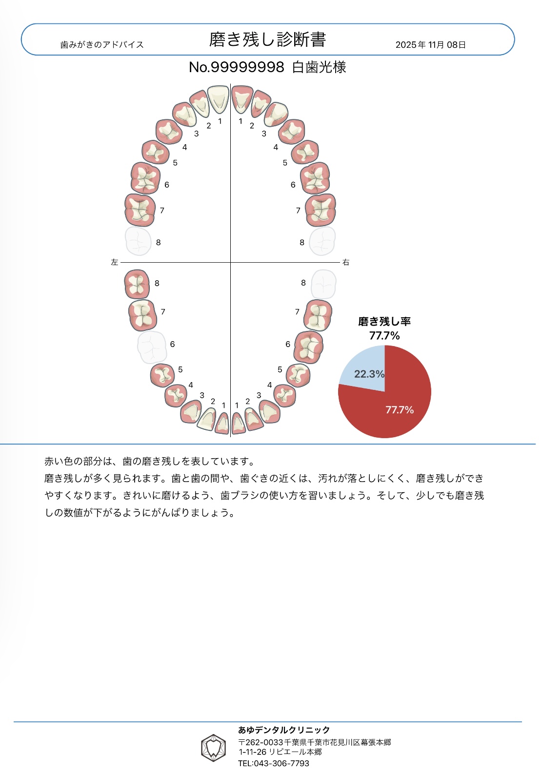 数値や図で「磨き残し率」や「出血率」が見えることで、日々の歯みがきへの意識が変わります。